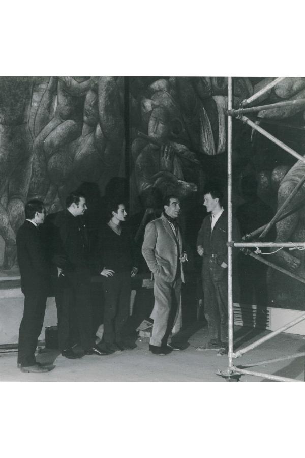 Pour accompagner le bâtiment, la municipalité commande deux œuvres réalisées entre 1965 et 1967. L'une est un escalier hélicoïdal en acier inoxydable par le ferronnier d'art Raymond Subes qui signe probablement son dernier travail. La seconde, une œuvre monumentale de l'artiste Blasco Mentor "A la conquête du bonheur" couvrant une toile de 400m² se voulant représenter le bonheur en mettant l'humain et la solidarité au cœur.