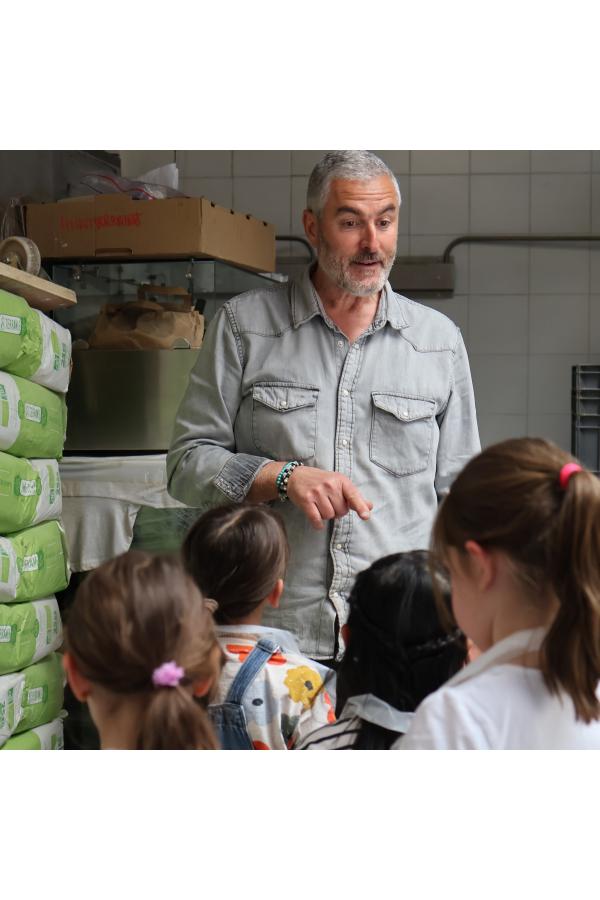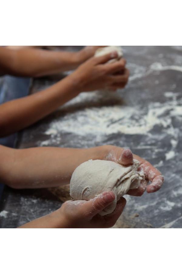 Dès votre arrivée, en tant que petits apprentis boulangers, vous serez accueillis par le boulanger, qui vous fera découvrir les secrets de la panification : le choix des farines bio, l’importance du levain et le rôle essentiel du pétrissage.