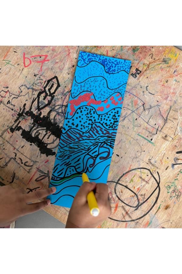 Durant l'atelier les enfants échangent et réalisent de petites créations à partir de feuilles colorées de tailles et de formes différentes sur lesquelles ils ont la liberté de dessiner des lignes, hachures, courbes, en s'inspirant des dessins de Pierre Charpin.