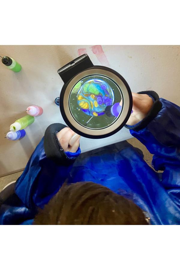 Cet atelier vous propose de créer une œuvre inspirée du liquid art. Expérimentez avec une loupe et différents liquides afin de créer une œuvre unique et collaborative !