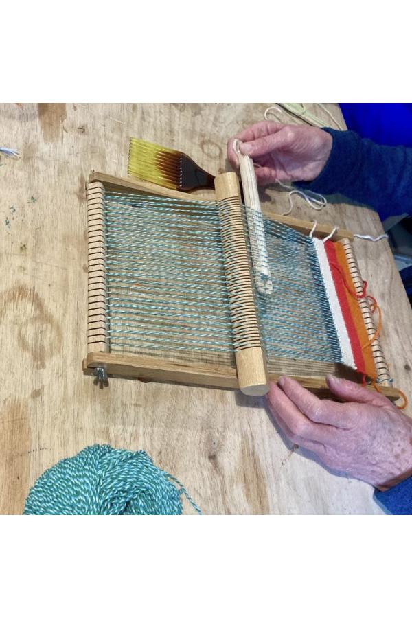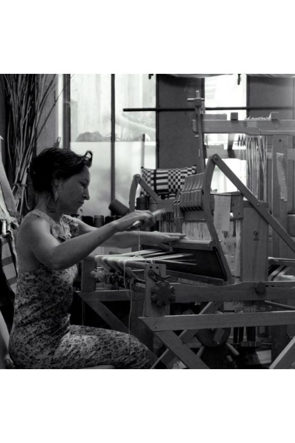 Dans une première séquence, les participant.e.s sont invité.e.s à découvrir le tissage grâce à une démonstration qu'elle réalisera sur son métier à tisser muni de huit cadres.