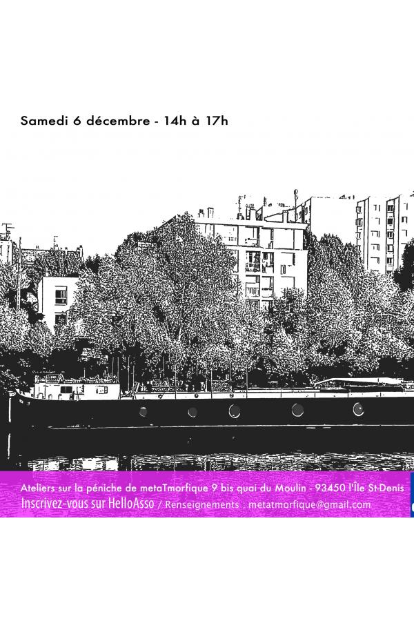 Les artistes Françoise-B Diallo et A-Claire Nizery de l'association mETATmorphique vous proposent un atelier Bijoux, design et recyclage pour fabriquer vos propres cadeaux : boucles d'oreilles, bracelets, porte-clés à l'approche des fêtes. Cet atelier se déroule sur la péniche de l'association à L'Ile-Saint-Denis.