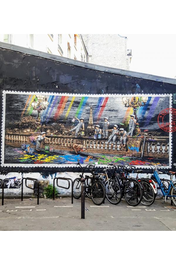 Entre chaque galerie, vous arpenterez les rues du quartier à la découverte d’œuvres emblématiques : les célèbres créations au pochoir de Banksy, la fresque 84Amelot, les mosaïques d’Invader et bien d’autres encore.